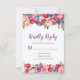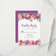 Beautiful purple and pink flowers, with a hint of blue create beautiful floral borders along the top and bottom of this RSVP card. Kindly Reply is written in large purple script letters. The back of the invitation is a deep purple. This can be changed to any colour to match your wedding décor. The text colour, size and font can also be customised.