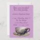 The pretty purple invitation features a floral tea cup on the bottom of the invite. The party information is featured in a darker purple above the tea cup. This beautiful invitation is sure to make any guest feel welcome.