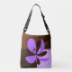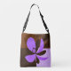 A stylish tote bag featuring a bold purple floral design with modern graphic shapes.