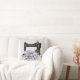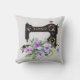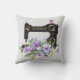 Sewing themed throw pillow patterned in a black vintage style sewing machine on a very light grey background, accented with your chosen monogram and a lavish bouquet of light purple flowers. Just edit the monogram. Your choice of styles and sizes. Nice accent for any sewing room or bedroom.