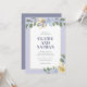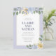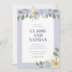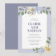 Design features elegant watercolor floral elements in various shades of dusty purples, blues and golds. Design also features various types of greenery and branches in greens and purples. The back side of this simple elegant invitation is a deeper shade of purple.