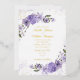 Beautiful wedding invitation with purple floral design and foil writing and dusting.