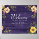 Rustic, elegant, modern, boho, purple wood wedding welcome poster with watercolor flowers and greenery.