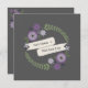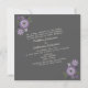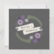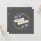 A wedding invitation featuring an illustration of purple flowers and greenery arranged in a circle with banner at centre. Personalise with names. Opposite side features flowers at top left and bottom right. Personalise the text with details of your occasion. Background is grey. Wording is from bride's parents.