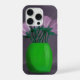 A simple bouquet of soft lavender flowers rises from a bright green vase, set against a muted gray-purple background. The petals are loosely painted, with visible brushstrokes that give them a gentle, airy softness, while the stems intertwine in darker green, adding a sense of organic movement. The vase is solid and bold, its vivid green color standing out strongly against the subdued backdrop, grounding the composition.