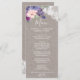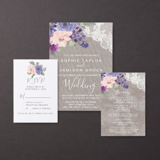 This purple flowers and lace dinner menu card is perfect for a country wedding. The rustic chic design features a beautiful arrangement of plum purple, lilac and blush pink flowers with white floral lace on an elegant linen background. This menu can be used for a wedding reception, rehearsal dinner, or any event.