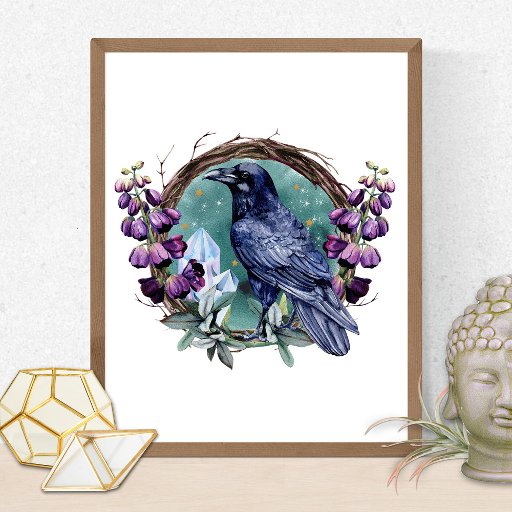 New Age pillow. Metaphysical design with beautiful watercolor of a magickal crow, purple flowers, blue crystals and twig wreath with stars.