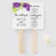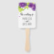 Beautiful floral bouquet with violet purple flowers and cursive script style handwritten calligraphy font floral spring wedding program hand fan. A bouquet of purple flowers and green leaves adorns the upper part.