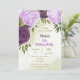 Beautiful birthday invitation featuring lilac and eggplant purple flowers and green leaves