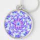 This keychain features a luminous abstract floral purple, lilac and magenta mandala design. The colours swirl around a central blue star.