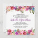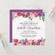 Gorgeous display of summer flowers in the top and bottom floral borders. Light pink watercolor flowers accented with deep purple, red and blue. Lots of greenery and leaves to keep the design light and airy. The wedding couple names are deep purple and so is the background. Very pretty way to incorporate purple, which is a very popular colour this year.