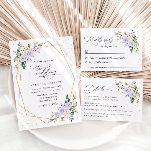 Add a personal touch to your wedding celebration with these stylish and memorable party items! Design features purple and white watercolor flowers, greenery, gold confetti and gold frame.