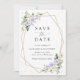 Invite friends and family in style and set the tone for your special day with this charming save the date card. Design features purple and white watercolor flowers, greenery, gold confetti and gold frame on white background.