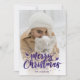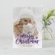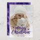 Custom purple photo Christmas cards featuring a photo with a snow overlay and hand lettered script font on the front and faux purple foil with snow at the back. Easily personalise these purple photo Christmas cards with your image and text.