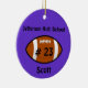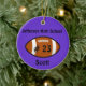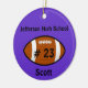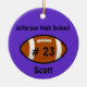 Custom football Christmas ornament done in a purple round shape ornament, with name and jersey number in black on a football icon. Personalise the name or text to suit your needs. Makes a nice ornament for kids or your star football player.