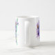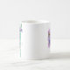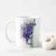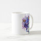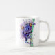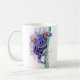 traditional watercolor and ink artwork of a purple coloured frog climbing up a tree while staring at the viewer on a coffee mug