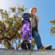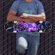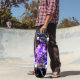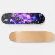 a decorative space artwork featuring a purple coloured space nebula with planets and moons emerging from black space on a skateboard.
