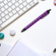 Cool and trendy, plastic pen that features an image of a little, purple Cranesbill Geranium flower on a background and printed in a repeating pattern. Select your pen ink colour and trim colour.