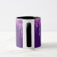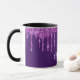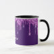 A girly and trendy monogrammed mug. A chic deep purple background decorated with faux glitter drips, paint dripping look. Personalise and add a name and monogram initials. Purple and white coloured letters. The name is written with a modern hand lettered style script.