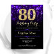 80th birthday party invitation. Elegant purple design with faux glitter gold. Features stylish diamonds, bokeh lights and script font. Men or women bday invite. Perfect for a stylish adult birthday party. Personalise with your own details. Message me if you need further customisation. Printed Zazzle invitations or instant download digital printable template.