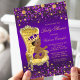 African American prince baby shower invitation with cute African American ethnic baby boy wearing a purple diaper and purple and gold crown sitting on a beautiful gold chair on a rich purple and gold confetti glitter background. This beautiful purple and gold baby shower invitation is easily customised for your event by simply adding your details in the font style, colour and wording of your choice. This is a printed design with no real glitter, confetti, jewels, etc.