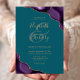 A purple watercolor agate design trimmed with faux gold glitter appears in two corners of this elegant design. Personalise it with the couple's names in gold-coloured handwriting script over a large ampersand. Add the wedding details in gold-coloured copperplate and italic fonts on a teal blue background. The reverse side features a matching purple and gold agate design.
