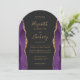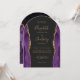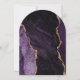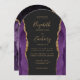 This elegant arch-shaped modern wedding invitation features purple watercolor agate side borders trimmed with faux gold glitter. The customisable text combines gold-coloured handwriting, copperplate and italic fonts on a dark charcoal grey background. The reverse side features a matching purple and gold agate design.