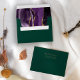 The inside of this elegant modern wedding invitation envelope features a purple watercolor agate design trimmed with faux gold glitter. Customise the back flap with the names of the bride and groom in gold-coloured handwriting script and return address in copperplate font on an emerald green background.