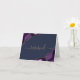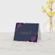 This elegant, modern wedding table reserved seating place card features a purple watercolor agate image trimmed with gold faux glitter in opposite corners. The word "reserved" appears in gold-coloured handwriting script with swashes before and after on a navy blue background on both sides of the card.