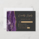 The left-hand edge of this elegant modern wedding RSVP enclosure card features a purple watercolor agate border trimmed with faux gold glitter. The title "Kindly Reply" appears in script, with customisable text below in gold-coloured sans serif font on a slate black background. The reverse side features a matching purple and gold agate design.