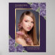 Elegant purple floral photo celebration of life/funeral welcome sign featuring purple roses and baby's breath flowers decorating a photo inside a gold frame. Matching items available.