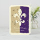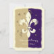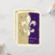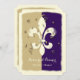 These invitations feature a washed out white elegant Fleur de Lis symbol covered in golden confetti in a gold, purple and off white colour scheme. Perfect for your New Orleans wedding event or other gathering!