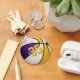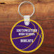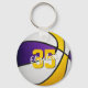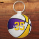 This easy-to-personalise basketball themed keychain features the realistic image of a basketball that has alternating purple, white and gold recolored panels on the front and a simple purple basketball shape on the back - easily personalise with player name & jersey number on the front and school or club name & mascot name on the back - by katz_d_zynes