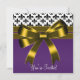 Elegant purple & gold Fleur de Lis black and white with bright gold bow design party invitation. This template design works well as an invitation to a birthday party, cocktail party, holiday party, corporate party, black tie formal, prom, retirement party, graduation party, bachelorette party, engagement party, wedding, New Year's Eve party, and any other special occasion. Add your details to the front and back by simply choosing the orange "Customise it!" button to begin adding your event details, font style, font size & colour, and wording. Gold fleur de lis party invitations. Please note - all of the invitation designs you will find on Zazzle are printed graphics on flat paper stock with no actual jewels, bows, raised, embossed, or added parts or pieces.