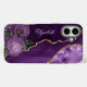 Purple Gold Floral Agate Monogram iPhone 16 Plus Case. Protect your iPhone in style with this chic and sophisticated cover featuring a stunning design of purple and gold agate and script monogram name personalised. Inspired by the mesmerising beauty of natural gemstones and geodes, this case showcases swirling marble-like patterns of deep purple accented with radiant gold veins. Elegant purple and gold floral roses add a romantic touch, perfectly blending opulence with nature's charm. This agate phone case offers reliable protection while elevating your phone's aesthetic. Ideal for those who love the timeless allure of gemstones and luxurious designs, this iPhone cover is both functional and fashion-forward, making it a perfect gift or personal accessory.