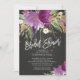 Purple & Gold Floral Bridal Shower Invitation featuring modern & chic purple and lavender flowers with gold accents set on an elegant black background.