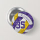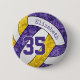 This team colours volleyball button features the realistic image of a stylised purple, gold & white volleyball that has an artsy floral kaleidoscopic pattern blended with its purple & gold panels - personalise with the athlete's name and jersey number - by katz_d_zynes