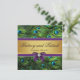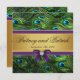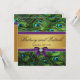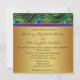 Purple & Gold Peacock Feather Wedding Invitations -- features a green peacock feather printed background. A printed gold band trimmed in purple graces the front and back. The front also features a matching printed bow with a diamond embellishment. These peacock wedding invitations are set to high quality basic card stock; however, you can change the stock to linen, felt (embossed), recycled, and several metallic shades if you would like under number 2 (choose your style, size & paper type) below the orange add to cart button. A list of the additional costs for a fancier card stock are displayed also under that option. Each invitation comes with a fitted white envelope.