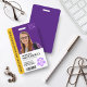 Colleges, universities, high schools, and institutes of higher learning can add sophistication to student photo identification badges with this modern, contemporary design, which features elegant lettering set on purple, gold, and white backgrounds. Customise with given and family names, student ID #, faculty name, name of college/university, years of study, and academic logo or slogan. Colours and font types can be modified as desired.