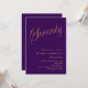 A modern, stylish invitation for a 70th birthday party. A purple coloured background and the word Seventy written with elegant large script letters in faux gold. Personalise and add a name and party details.