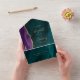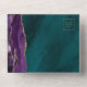 The left-hand edge of this elegant modern all-in-one wedding invitation and RSVP features a purple watercolor agate border trimmed with faux gold glitter. The detachable RSVP card includes space for guests to initial their choice of three entrees. The customizable text combines gold-colored handwriting, copperplate and italic fonts on a teal blue watercolor agate background. The return address appears on the outside flap and on the reverse side of the RSVP.