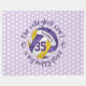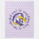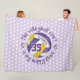 This cute volleyball themed fleece blanket for girls features the realistic image of a volleyball that has purple, gold and white panels, upon which you can customise the athlete's name and jersey number - encircling the volleyball is the text, "The volleyball court is my happy place" in blue in a fun and casual, handwritten style font with two hand drawn heart outlines - the volleyball's purple and gold panels are blended with an artsy, feminine digital texture - a tiny volleyball dots pattern overlies a customisable pale purple background - katz_d_zynes