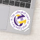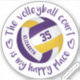 This volleyball vinyl sticker features the realistic image of a purple, gold and white volleyball encircled with the phrase, "The volleyball court is my happy place" and two heart outlines in casual, handwritten style, purple lettering - personalise the athlete's name & jersey number - by katz_d_zynes