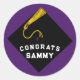 Classic graduation gift stickers or party favour labels featuring black graduation cap with gold tassel on a purple background. Edit text to add senior class grad's name.