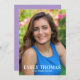 A stylish graduation photo invitation template featuring a calligraphy script, utilizing purple school colors. It includes the graduate's name, the high school or college name, the class year, and details for the graduation party. Chic, stylish, and minimalist design.