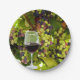 Green grapes ripen to a deep purple on a vine full of leaves in a vineyard with a wineglass of red wine in front.  These organic, wine grapes are one of the many gifts from nature.  These paper plates are fully customizable.