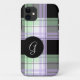 Monogram iPhone 5 case designed with a funky plaid pattern in purple, green, and black, and personalised with your initial in white over a black circle.