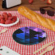 Get all funky with this fabulous piece featuring a purple, green & blue design with black accents.