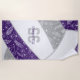 This fun volleyball themed beach towel for her features the realistic image of an abstractly oversized volleyball that has purple, grey and white panels - a continuous doodle pattern of paisleys, flowers and feathers in white covers the volleyball's purple and grey panels - personalise with the athlete's name and monogram, varsity letter or jersey number - by katz_d_zynes