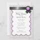Beautiful invitations with a heather grey & white damask pattern and a black ribbon design with purple at the top.